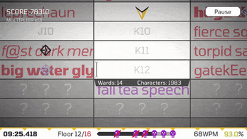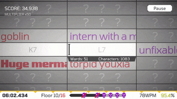 To motivate players to play again and improve at typing, I'm thinking of some kind of persistent score system calculated from average WPM, accuracy, and completion time, along with a "journal" of past runs.
